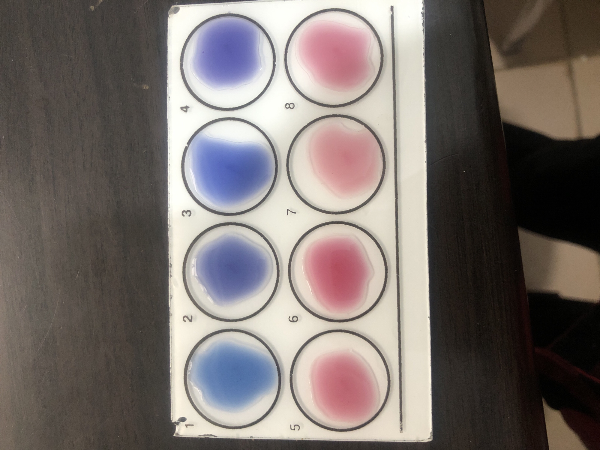 A white, rectangular diagnostic slide with eight circular reaction wells is depicted from an overhead perspective, resting on a dark, textured surface. The wells are arranged in two rows of four, numbered 1 through 8. Wells 1, 2, 3, and 4 in the top row contain varying shades of blue to purple liquid. Wells 5, 6, 7, and 8 in the bottom row contain varying shades of pink liquid. The liquids exhibit no visible agglutination. The dark background surface appears to be a workbench or table, with minimal extraneous details. A portion of a dark fabric item and a lighter object are partially visible at the bottom right of the frame, indicating surrounding items or a person's presence. No individuals are visible, and no actions are in progress. The image provides no visual information to confirm a specific location within the city of Jos, Nigeria.
