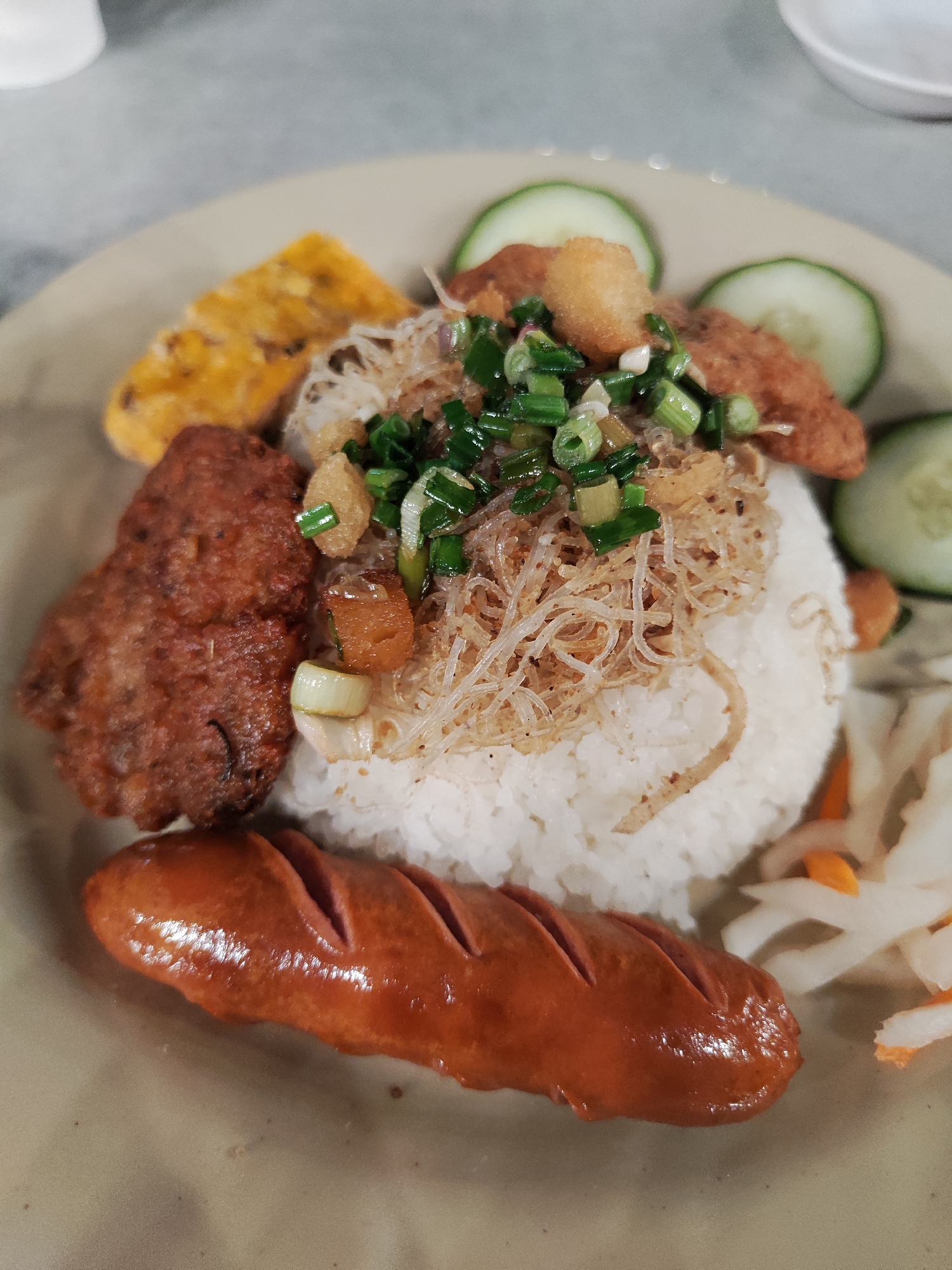 A close-up shot reveals a plate of Vietnamese cuisine, specifically "Com Tam," commonly known as broken rice. A mound of white rice dominates the center of the plate, topped with fried vermicelli noodles, crispy fried shallots, and fresh chopped scallions. Surrounding the rice are various accompaniments: a grilled sausage with visible score marks, a deep-fried pork chop with a textured surface, a square of yellow omelet, and pickled vegetables (likely daikon and carrots). Slices of cucumber are placed as garnish. The plate is a neutral beige color. This dish is photographed in Da Lat, Vietnam.