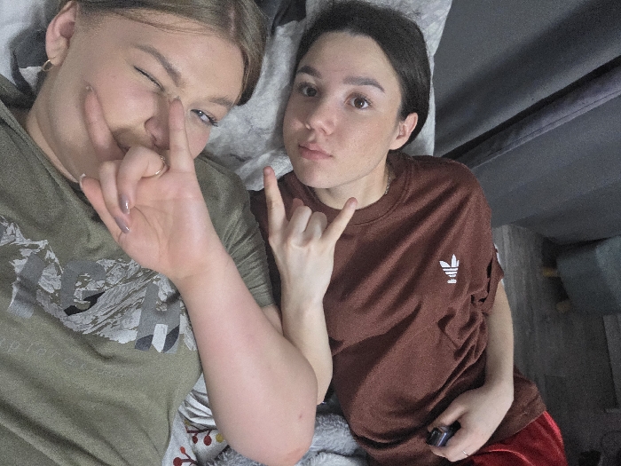 Two individuals are depicted in a close-up, downward-angled indoor photograph, lying on a grey textured surface, likely a bed or couch. The environment appears to be a residential interior, with grey curtains visible on the left side of the frame and a light blue upholstered furniture piece in the upper right background. The individual positioned towards the upper part of the frame has dark hair and is wearing a reddish-brown t-shirt featuring a white Adidas logo and red lower garments. This person is looking directly at the camera with a neutral expression. Their right hand is raised, forming a "rock on" gesture with the index and pinky fingers extended. Their left hand holds a small, dark cylindrical object. The second individual, positioned towards the bottom of the frame, has lighter brown hair and is wearing an olive green t-shirt with a grey and white graphic design. This person is winking with their left eye, and their left hand is pressed against their face, manipulating their nose and mouth in a playful manner. A small hoop earring is visible in their left ear, and a ring is present on their left ring finger. Their fingernails are painted a light taupe color. A patterned blanket featuring autumnal leaf designs in red, green, and brown is partially visible beneath the second individual's right arm. The specific location within the city of Chaikovsky, Russia, cannot be determined from the visual information provided in the image.