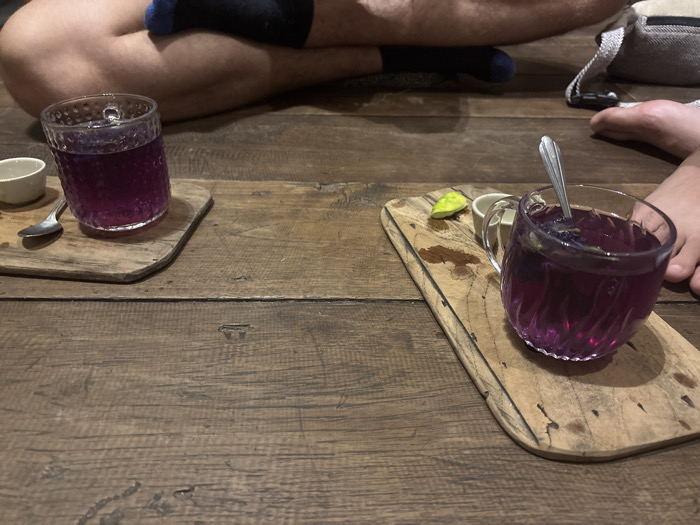 Two people sit on a wooden floor at floor level. Each has a glass mug containing a purple liquid, placed on a wooden cutting board. One mug has a spoon in it and a wedge of lime and a small dish. The other mug has a spoon and a small dish. One person wears socks. A bag rests beside one person's foot. The floor is made of planks of wood.