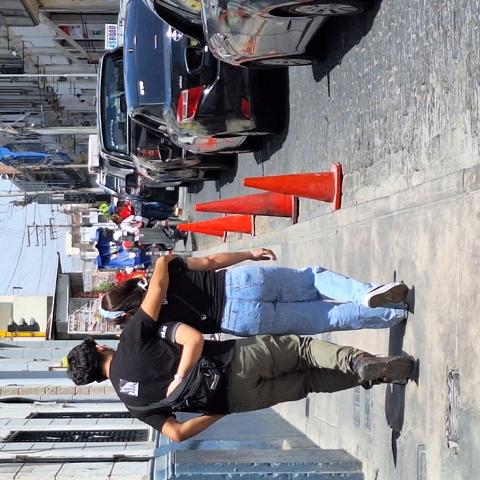 The image displays a daytime urban street scene in Arequipa, Peru. In the foreground, two individuals walk away from the camera on a concrete sidewalk. The person on the left is male, wearing a black t-shirt with a white graphic, dark green pants, and dark boots; a black fanny pack is slung across his chest. His right arm is placed around the shoulder of the female companion on his right. The female wears a black t-shirt, light blue jeans, white sneakers with dark accents, and a light-colored headband. Her left arm is positioned around the male's lower back. To the immediate right of the sidewalk, four orange traffic cones are evenly spaced along the curb, separating the pedestrian area from a cobblestone street. A queue of parked or slowly moving vehicles, including a dark sedan and a dark pickup truck, occupies the street. Buildings with varying facades, including a structure with a light blue lower section directly adjacent to the sidewalk on the left, line both sides of the thoroughfare. Further down the street on the left, a blue vendor cart or truck is visible with several individuals gathered around it. Overhead utility lines and a traffic light are present in the background. The scene is illuminated by bright, direct sunlight, evidenced by distinct shadows.