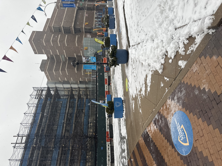 A street scene in winter. Buildings rise on the left, one under construction. Blue planters line the walkway alongside snow-covered sidewalks. Pennants decorate the sky. A circular sign on the brick pathway reads "Yeshiva University". The sky is overcast with falling snow.