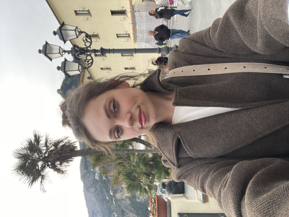A young adult female with light skin and brown hair in an updo is centered, taking a selfie outdoors in Pogerola, Italy