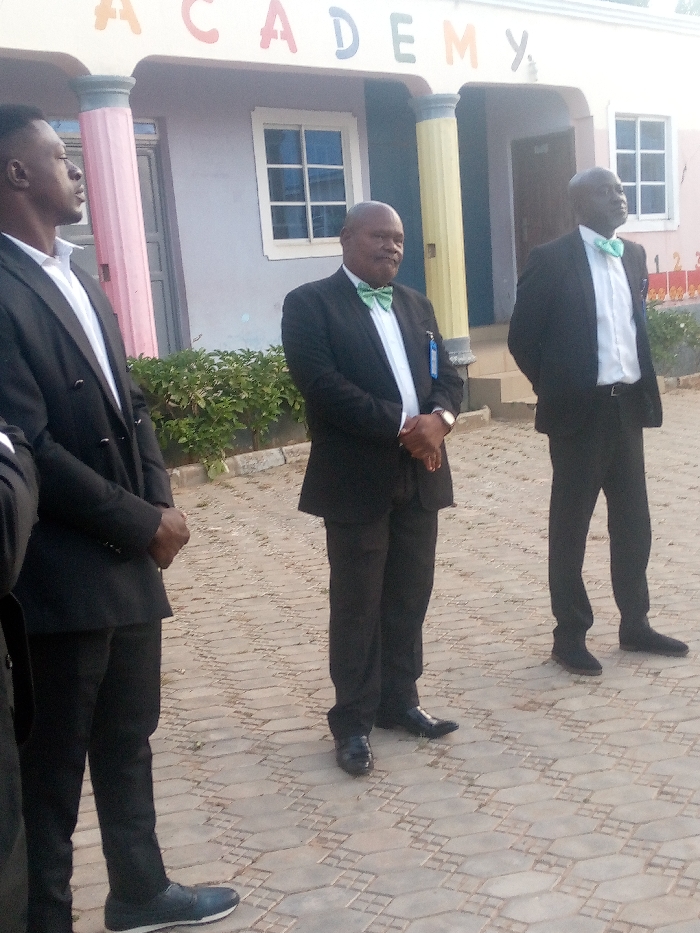 Three men stand in a line in front of a building labeled "Academy". They are dressed in black suits with white shirts and light green bowties. Two of the men are wearing dress shoes, while the other is wearing sneakers. The building has colorful columns and windows with white frames. The ground is paved with hexagonal tiles. A small hedge is behind the man in the center.