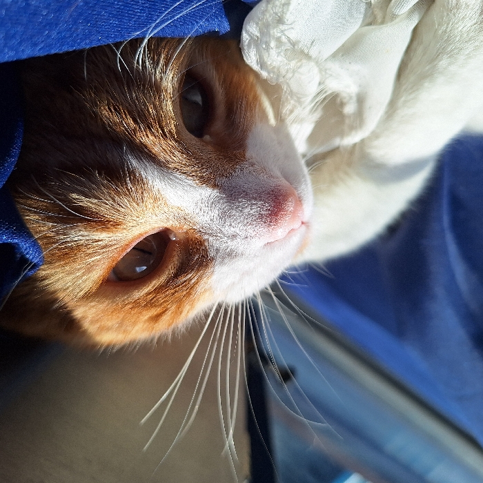 A domestic shorthair cat, predominantly orange and white, is depicted in a close-up, high-angle shot. The cat lies supine with its head inverted, gazing directly at the viewer. Its face features a white muzzle, a prominent pink nose, and amber-colored eyes with partially dilated pupils. Patches of orange fur surround the eyes and cheeks, while long, white vibrissae extend laterally from the muzzle. The cat's white chest fur is visible. It rests within a blue fabric material, likely bedding or a carrier liner, with additional bunched white fabric visible on the left side of the frame. Strong, natural illumination casts highlights on the cat's features, particularly the nose and fur. The background is an undifferentiated blur of blue and lighter hues, indicative of an interior setting. The scene is located in the city of Unknown, Unknown.