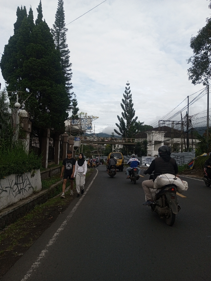 The image displays a street scene in Sandamal Eliya, Sri Lanka, captured under an overcast sky. The dark asphalt road, marked with a continuous white line along its left edge, extends into the background. On the left, an ornate dark fence with decorative elements and an attached spherical street light borders a property. Beyond the fence, several tall, dark green coniferous trees rise prominently. A concrete drainage ditch runs parallel to the road, with grass and black graffiti covering a retaining wall above it. Two pedestrians walk along this shoulder towards the viewer: a male in a black graphic t-shirt, dark shorts, and white sneakers, and a female wearing a white long-sleeved top, light trousers, and a dark hijab. Traffic in the mid-ground moves away from the viewer. A dark motorcycle in the foreground carries a rider wearing a black helmet and jacket, with a large white sack secured to the rear seat. Further ahead on the road, additional motorcycles are visible, including one with a rider in a blue and white top. A yellow van follows behind them. An overhead pedestrian bridge or overpass spans the road, featuring a sign structure with partially discernible white text reading "PER" and "SIBARI." Distant mountains, partly obscured by clouds, form the far background. On the right side of the road, multiple utility poles with complex wiring are present. Various buildings, including a multi-story structure with white facade elements and what appears to be scaffolding or exposed structural components, line this side of the street. More tall, slender coniferous trees are interspersed throughout the middle and distant areas.