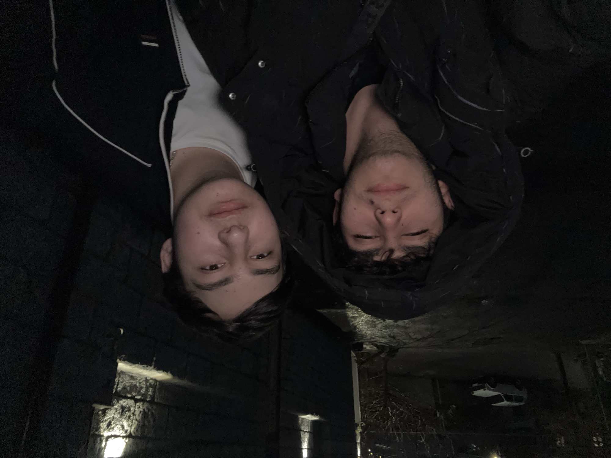 Two young men are close together in a selfie-style image, rotated 180 degrees