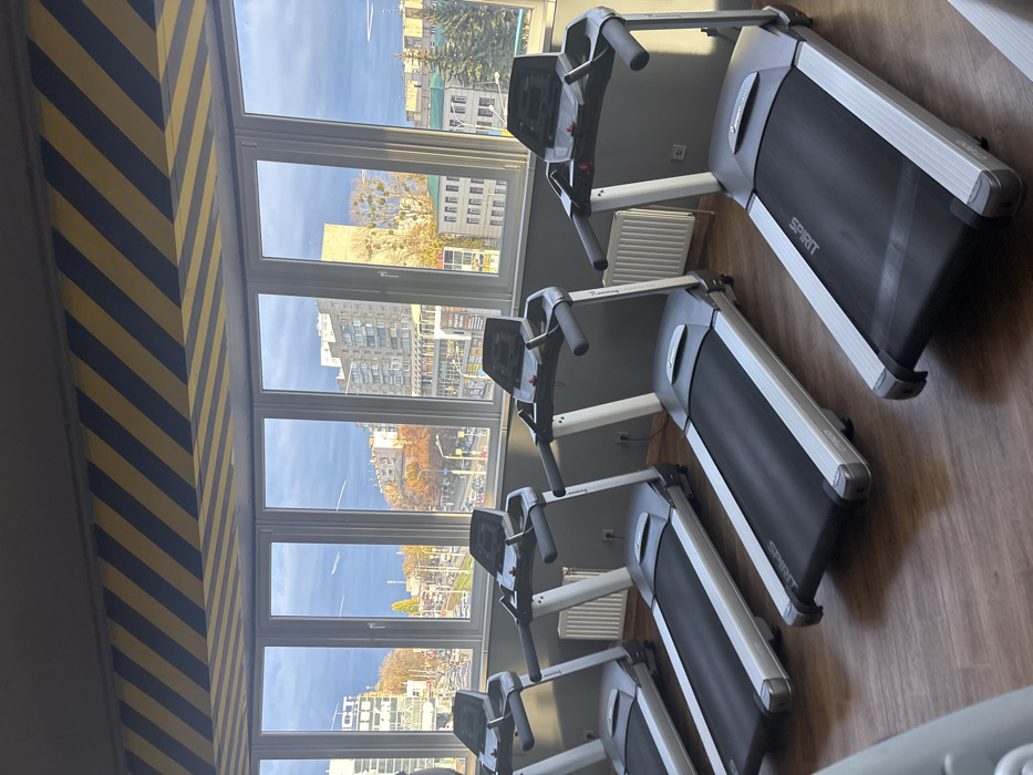The image captures the interior of a fitness center, specifically a treadmill area, situated in Kharkiv, Ukraine