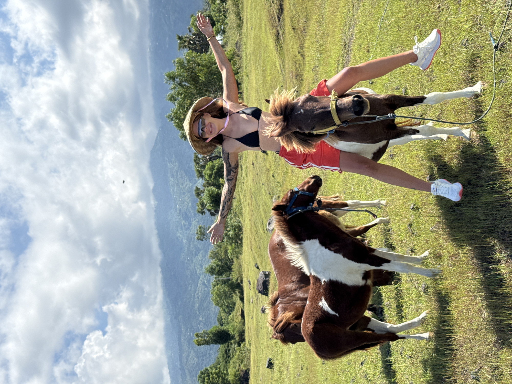 woman riding a small horse in a grassy field in Tianyar, Indonesia. In the background, are trees, a mountain, and clouds. The woman has her arms outstretched and is wearing a black bikini top, red shorts with white stripes, white sneakers with red accents, a sun hat, and sunglasses. The horse is brown and white and wearing a yellow bridle. A second horse is also visible in the foreground.