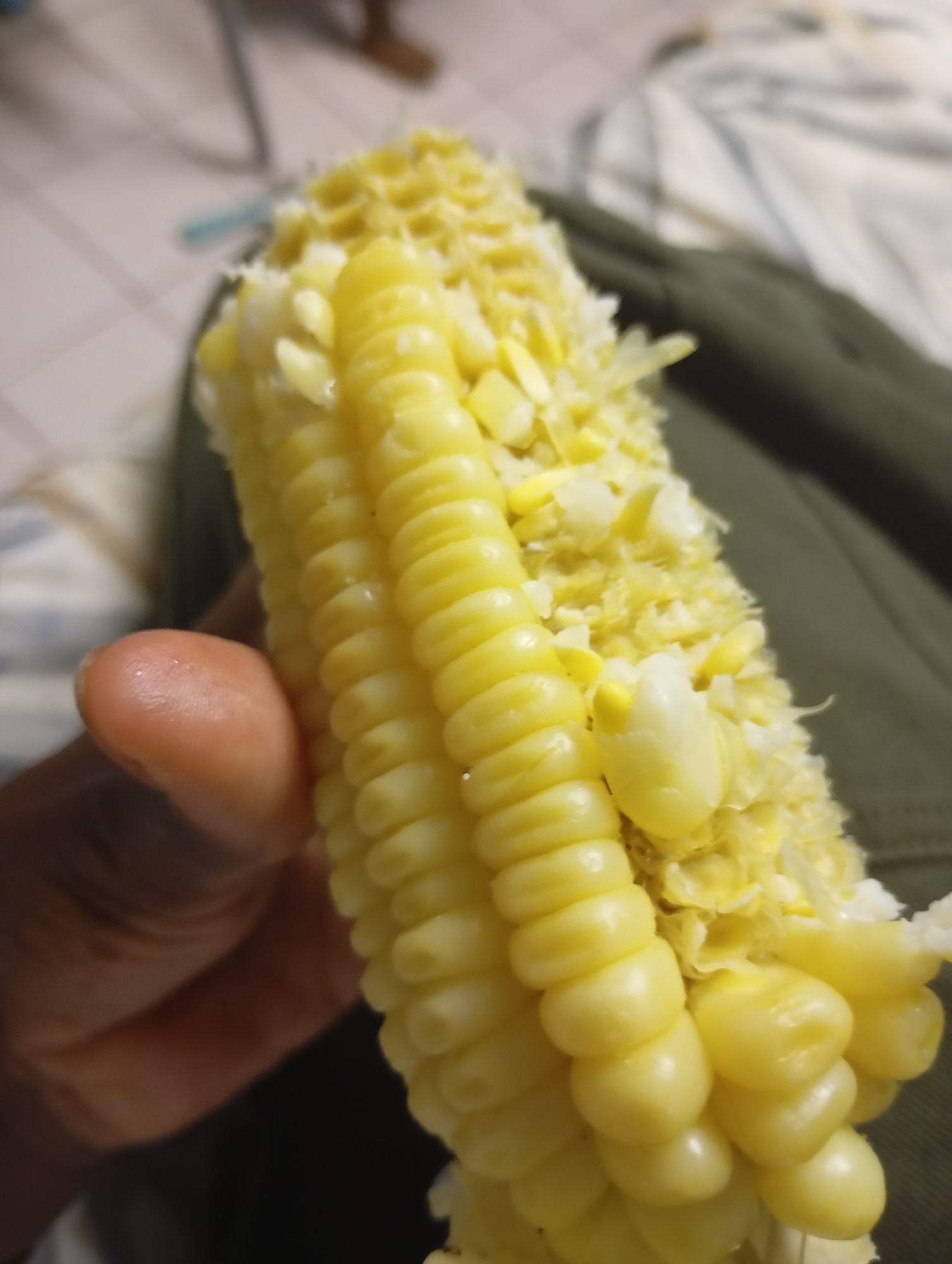 A close-up image depicts a partially consumed ear of yellow corn held by a hand with a dark skin tone. The corn exhibits an irregular section where kernels have been removed, exposing the cob. The remaining kernels are light yellow and intact. The background is out of focus, revealing a dark green fabric, a striped light-and-dark patterned textile, and a light-colored surface with a faint grid pattern. The scene takes place indoors in Johannesburg, South Africa.