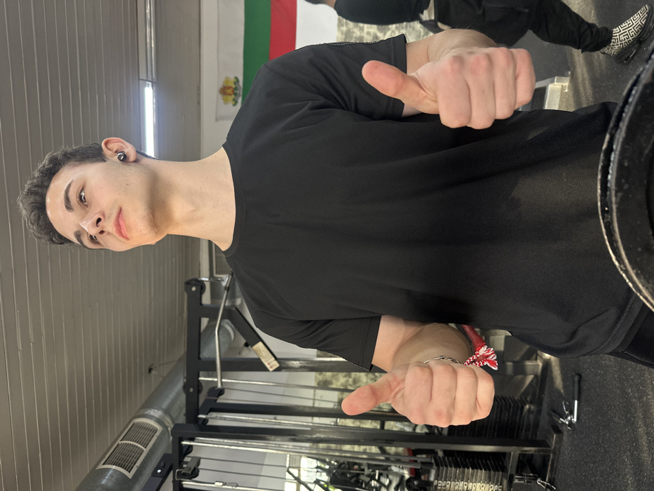 A young male, with light skin and short dark hair, is depicted from the waist up, facing slightly right and looking upwards in a gym setting within Cherven Bryag, Bulgaria