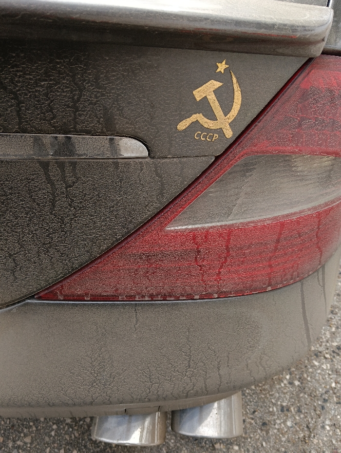 The image presents a close-up, angled view of the rear section of a dark-colored vehicle, observed in Charkovo, Bulgaria. The vehicle's surface, including the trunk lid and bumper, is uniformly covered with a layer of fine dust and grime, exhibiting vertical streaks consistent with water runoff and drying. A golden adhesive emblem, depicting a hammer and sickle surmounted by a five-pointed star, with the Cyrillic letters "CCCP" positioned beneath the hammer and sickle, is affixed to the right side of the trunk lid, positioned above and to the left of the taillight. A portion of the vehicle's red taillight is visible on the right side of the frame, also coated with dust. Below the textured, dark gray bumper, two polished chrome exhaust tips are visible, reflecting ambient light. The ground surface directly beneath the vehicle is characterized as dark, speckled asphalt. No individuals or active interactions are visible within the frame.