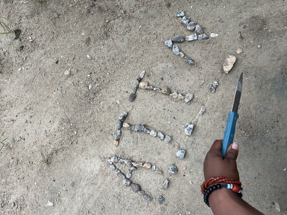 The image depicts an overhead view of a light brown, sandy-dirt ground in Lokoja, Nigeria, containing scattered small pebbles and minimal sparse vegetation. The capital letters "ATTN" are formed on the ground using multiple irregularly shaped grey and brown stones. In the lower-left foreground, a dark-skinned hand is visible, adorned with one black beaded bracelet, one reddish-brown beaded bracelet, and one light blue beaded bracelet. The hand holds a knife with a light blue handle featuring two visible rivets and a silver-colored blade, which is pointed towards the lower-right quadrant of the frame, adjacent to the rock formation.