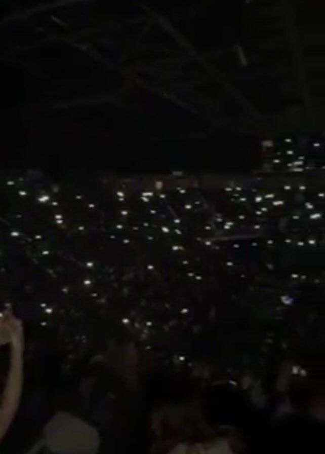 n arena filled with a large crowd holding up their phone lights during a concert. The lights create a sea of shimmering dots throughout the dark venue. A stage is visible in the distance, featuring screens displaying images and a band performing. The camera is positioned among the crowd, capturing the backs of heads and shoulders of people in the foreground. The overall atmosphere appears lively and energetic.