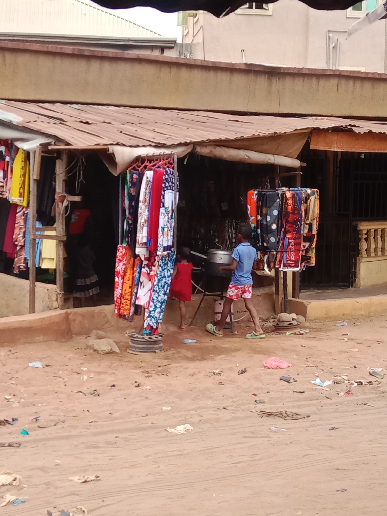 The image depicts a street scene in Onitsha, Nigeria, characterized by an informal market stall and dirt ground. The foreground consists of an unpaved, reddish-brown dirt surface, scattered with various pieces of refuse, including plastic bags and unidentified debris. In the mid-ground, a single-story market stall is visible, constructed with a weathered, rust-colored corrugated metal roof supported by wooden posts. The stall's open front displays numerous articles of clothing and fabrics of assorted colors and patterns, hanging on metal racks. One clothing rack on the right is stabilized by a black tire rim at its base. Three individuals are present. A young boy, dressed in a light blue short-sleeved shirt, red and white patterned shorts, and light green slides, stands facing left, positioned near a large, cylindrical silver cooking pot on a metal stand. His left arm is bent, reaching towards the pot. To the left of the boy, a child in a red short-sleeved dress and light-colored flip-flops stands with their back to the viewer, near a clothing display. Partially visible inside the stall is a third individual wearing a red top and a dark skirt with a ruffled hem. The background features a multi-story building with a light-colored facade and a flat roofline. A concrete wall with a cream-colored balustrade and a dark metal gate are visible to the right, behind the boy.