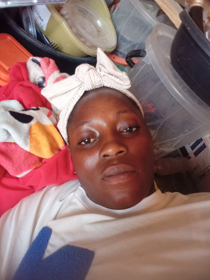 The image displays a close-up, upward-angled view of a dark-skinned female subject, captured in what appears to be a self-portrait from a reclining position. She wears a light-colored t-shirt, showing a partial blue design on the lower left, and a light-toned, striped fabric headband tied in a bow on her head. Her expression is neutral. To the subject's left, a pile of red fabric is visible, topped by a multi-colored patterned blanket or towel. To the subject's right, the background is cluttered with assorted plastic containers and household items, including a yellow-green basin holding smaller clear plastic containers, an orange rectangular container, a large clear plastic tub, and a dark-colored bucket. The scene represents an indoor, domestic environment located in Minna, Nigeria.