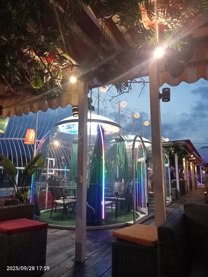 The image depicts an outdoor dining or lounge establishment located in Waso ward, Kenya, captured at approximately 17:59 on September 28, 2025, during dusk or early evening hours. The scene features multiple transparent, geodesic-style dining pods, primarily constructed from clear panels, positioned on a dark wooden deck. The closest pod, centrally located, is circular at its base and contains a circular table with at least two dark-colored chairs. Its interior floor is covered with green artificial turf. Vertical, multi-colored LED light strips, emitting blue, green, purple, and red light, are integrated into the pod's structure. Additional similar pods extend into the background to the right. An overhead structure, possibly a pergola or awning, covers portions of the area. It is adorned with green artificial foliage and contains small, warm-toned string lights. A section of a yellow and white striped awning is visible on the left. White support posts punctuate the scene, some equipped with spotlights. A large plant with broad green leaves stands to the left of the central pod. In the foreground to the left, a dark woven outdoor seating unit with a red cushion is partially visible. To the right, another similar seating unit with an orange cushion is partially visible. The background shows a cloudy, dark blue-grey sky. Against the sky, several large, illuminated spherical decorative light structures are visible, appearing as part of a larger installation. A covered walkway or additional seating area extends along the right side of the image, featuring more overhead structures and lighting. No individuals or discernible human actions or interactions are present in the image.