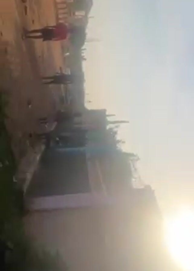The video, recorded in vertical format, shows a group of people on a dirt road. The road has patches of grass on one side, and is bordered by a curb. In the background, buildings and trees are visible. Several people, including at least one wearing a pink shirt and another in a green shirt, are seen in the middle of the road. They are moving and interacting. The light is bright, and there is a hazy appearance.