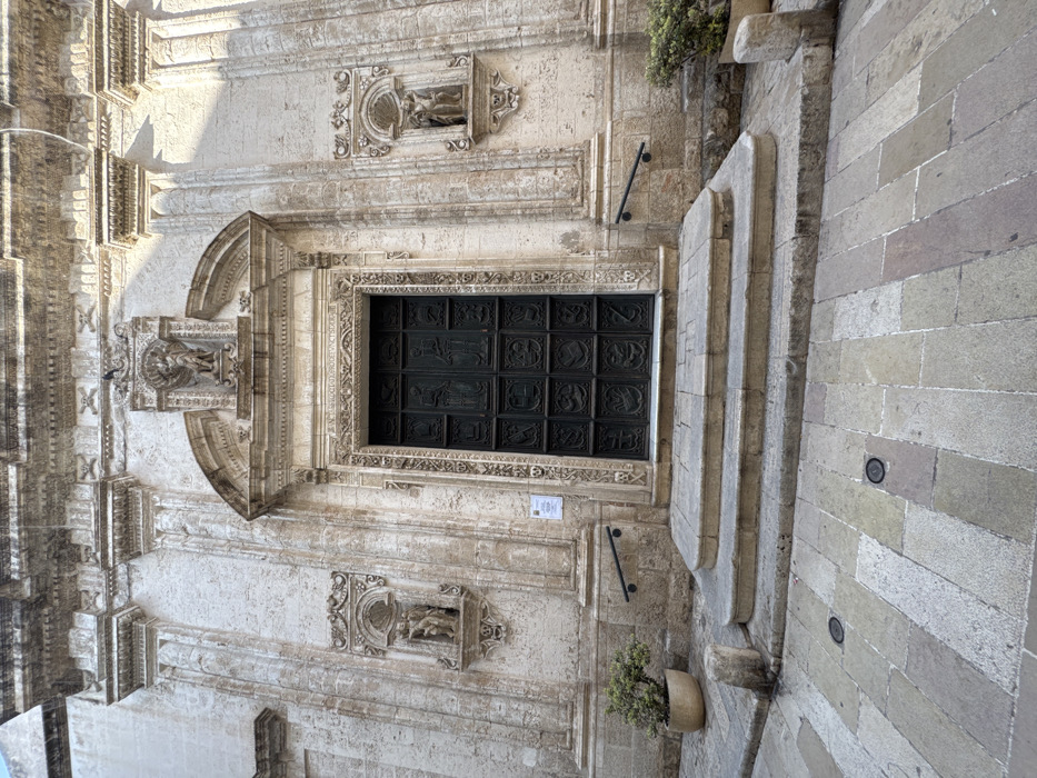 The image displays the ornate Baroque facade of the Basilica Concattedrale di Maria Santissima della Madia, situated in Largo Cattedrale within the Old Town of Monopoli, Italy. A large, dark bronze entrance door, composed of 18 rectangular panels featuring bas-relief scenes, is centrally positioned. This door is framed by an intricately carved light stone architrave, adorned with decorative patterns including skulls. Above the door, a prominent sculpture of the Madonna della Madia is centered within an arched pediment, flanked by decorative pilasters. To the left of the door, a stone niche houses a sculpture identified as St. Michael the Archangel, while a corresponding niche on the right contains a sculpture of St. Joseph with the Child Jesus. The facade itself is constructed from aged, light-colored stone blocks, displaying weathering and architectural detailing such as cornices and friezes. Three wide, shallow stone steps lead up to the entrance, with an additional smaller, curved step at ground level. Black metal handrails are affixed to the stone wall on either side of the steps. Two manicured evergreen plants in light-colored terracotta pots are placed symmetrically on the ground flanking the steps. The ground in the immediate foreground is paved with irregularly shaped, light-toned stone slabs, exhibiting variations in grey and beige, interspersed with two dark circular utility covers. The scene is illuminated by strong sunlight originating from the right, casting distinct shadows. No individuals are present in the frame.