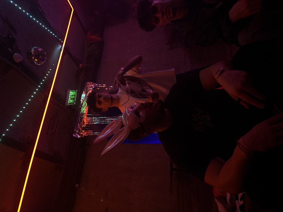 The image depicts three males within a dimly lit nightclub or bar environment, identified by an emergency exit sign displaying "ИЗХОД" (Exit) in Cyrillic, suggesting a location in Sofia, Bulgaria. The venue is consistent with the aesthetics of "Once Upon a Time, Biblioteka" in Sofia. The ceiling features a small disco ball, a prominent linear orange-red neon light strip, and green LED string lights. An emergency exit sign with a green running man pictogram is positioned on a dark wall. Behind the central figure, a shimmering silver tinsel curtain is suspended, with what appears to be a dark artificial plant visible to its right. The overall lighting is predominantly red and purple ambient, creating deep shadows. In the left foreground, a male with a muscular build wears a black t-shirt with a light-colored graphic. He is wearing large, reflective, translucent bunny ears as part of a headpiece or mask, which catch and reflect the neon lights. His face is mostly obscured by shadow and the headpiece, but he appears to be looking towards the left side of the frame, slightly upwards. He wears a light-colored bracelet on his left wrist and a ring on his left hand. Centered in the mid-ground, a standing male with dark, curly hair and facial hair wears a white t-shirt and a thin silver chain necklace. He is holding a dark, circular, flat object, possibly a vinyl record or decorative disc, with both hands against his chest. He gazes forward with a neutral expression. In the right foreground, partially obscured by shadow, a third male with dark, curly hair sits. He is wearing a dark jacket or shirt and is looking forward. His face is partially illuminated on the right side. No direct interaction between the three individuals is explicitly depicted.