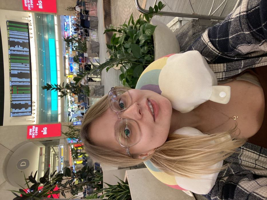 - "A blonde-haired female subject, wearing clear-framed glasses, a rainbow-colored neck pillow, a dark plaid shirt over a brown tank top, and a small golden key pendant, is depicted in a selfie" by FM-k41Xm2, licensed under CC BY 4.0
