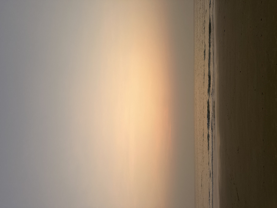 The image displays a coastal scene at Betalbatim, India, characterized by a vast, empty expanse. The upper two-thirds of the frame consists of the sky, exhibiting a subtle gradient from light grey-blue at the zenith, transitioning through pale orange-yellow, to a soft, hazy pinkish-orange just above the horizon line. No distinct clouds are visible. The middle section, approximately one-quarter of the image, depicts the sea, reflecting the warm hues of the sky with a muted golden-brown coloration. Small, low-amplitude waves are breaking close to the shore, indicated by subtle lines of white foam. The bottom quarter of the image is comprised of a flat, dark brown sandy beach, appearing wet along the waterline. No individuals, animals, structures, or objects are present within the frame, and no actions or interactions are depicted.