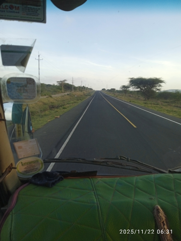 A forward-facing view from inside a vehicle shows a straight asphalt road stretching into the distance under a pale sky. A solid white line marks the left edge, and a broken yellow line separates lanes. Sparse vegetation and utility poles line the roadside. Part of the dashboard and green seat are visible in the foreground. A date stamp reads "2025/11/22 06:31".