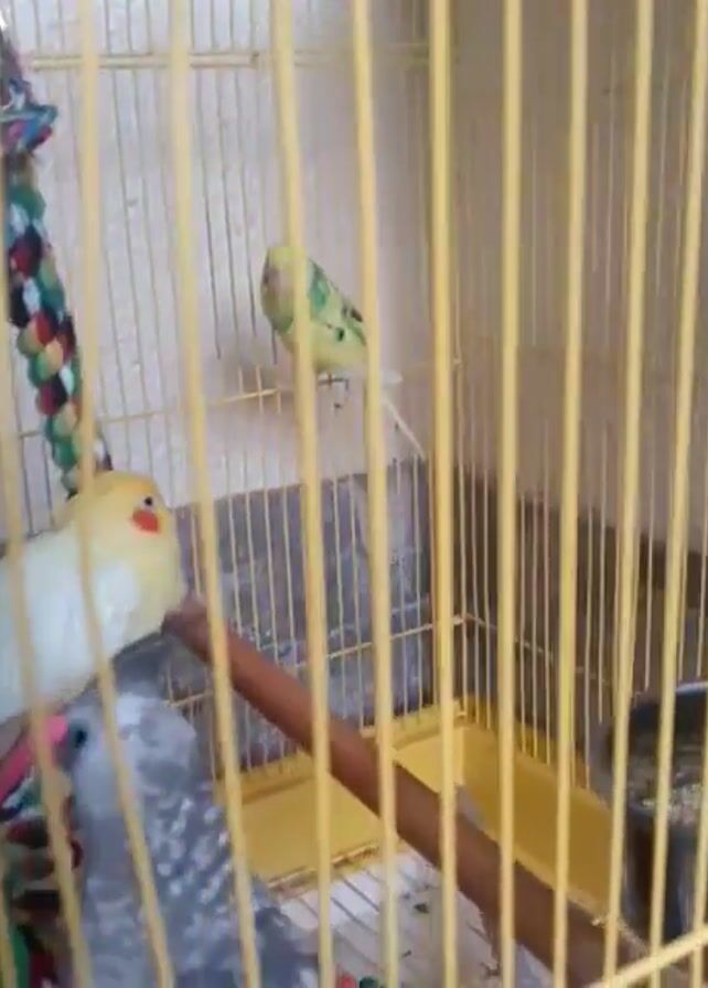 In a close-up shot, a yellow birdcage contains four birds of varying colors and species. A yellow and white cockatiel with a red cheek patch is perched on a colorful rope toy. Below the cockatiel, a gray and white bird sits at the bottom of the cage. A yellow and green budgie is perched on a horizontal bar at the back of the cage. A fourth bird, whose color is not discernible, also appears at the bottom of the cage. The cage is simple, with yellow bars and a few perches. The birds remain mostly still throughout the short clip.