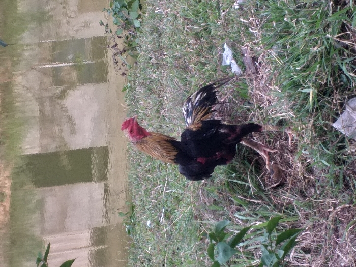 - "An adult rooster is depicted standing on a grassy bank adjacent to a body of water in Lhokseumawe, Indonesia" by FM-lMQUs2, licensed under CC BY 4.0