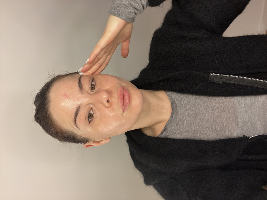 The image depicts an adult female subject from the chest up, positioned against a plain, light-colored background. Her dark hair is pulled back. She has brown eyes and full lips. A small red blemish is visible on her forehead. She wears a grey long-sleeved undershirt beneath an open, black, textured cardigan or hoodie with a visible zipper detail on the right side of the frame. Her left hand is raised to the left side of her head, with fingers splayed, covering a portion of her temple and forehead; her fingernails are painted white. The subject looks directly at the camera. The environment is an indoor setting with an unidentifiable, uniform wall. While the specific location in Carency, France, cannot be visually confirmed by the image, the scene is an interior space, likely a room.