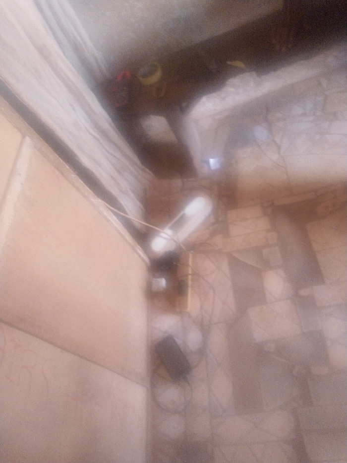 The image depicts a severely blurred, indistinct, and dimly lit indoor scene within Unknown, Unknown. The perspective is angled downward, focusing on a corner of a room. To the left, a light-colored, smooth vertical surface, possibly a wall or furniture, is visible. Adjacent to this, a lighter, textured vertical material, consistent with a curtain or fabric, extends upwards. The floor, visible in the lower right and central areas, is covered with light-toned, irregularly patterned tiles. No individuals are present. On the tiled floor, a white, elongated object is centrally positioned. Below and to its right, a dark, rectangular electronic device, resembling a power adapter, rests amidst a dense tangle of multiple dark cables and wires that are spread across the floor. In the upper-left background, indistinct objects, including a yellow-colored item, are vaguely discernible on a darker surface. A small, bright, rectangular, illuminated or reflective object is also present in the mid-right background. The scene appears static and suggests a cluttered area with electronic accessories.