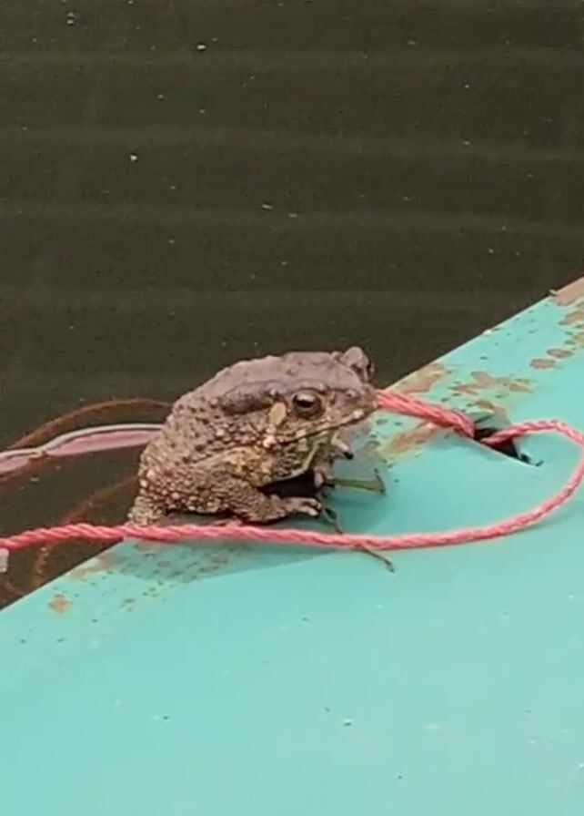 A toad is perched on the side of a turquoise boat, close to the water's edge. A red string runs around the toad, possibly looped through a hole in the boat's edge. The water is a dark, still color.