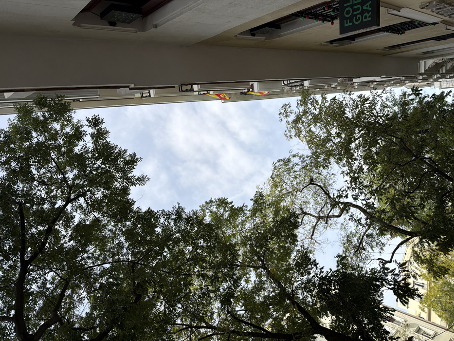 The image presents an upward perspective of a street in Madrid, Spain, specifically at Calle de Alcalá, 38. The left and lower-center portions of the frame are occupied by the dense, green foliage of several large trees, with visible branches and twigs intertwining. Above and between the tree canopy, a light blue sky with scattered white clouds is visible. To the right, a multi-story building with a light-toned, possibly cream-colored, facade rises vertically. The building features several balconies with black wrought iron railings. Two Spanish flags, characterized by horizontal red-yellow-red stripes, are displayed from two distinct balconies. A lower window on the building's right side is adorned with red and green spherical decorations. Directly beneath this window, a rectangular sign with a dark background and light green lettering reads "FOLGUERA". No individuals or discernible activities are present.