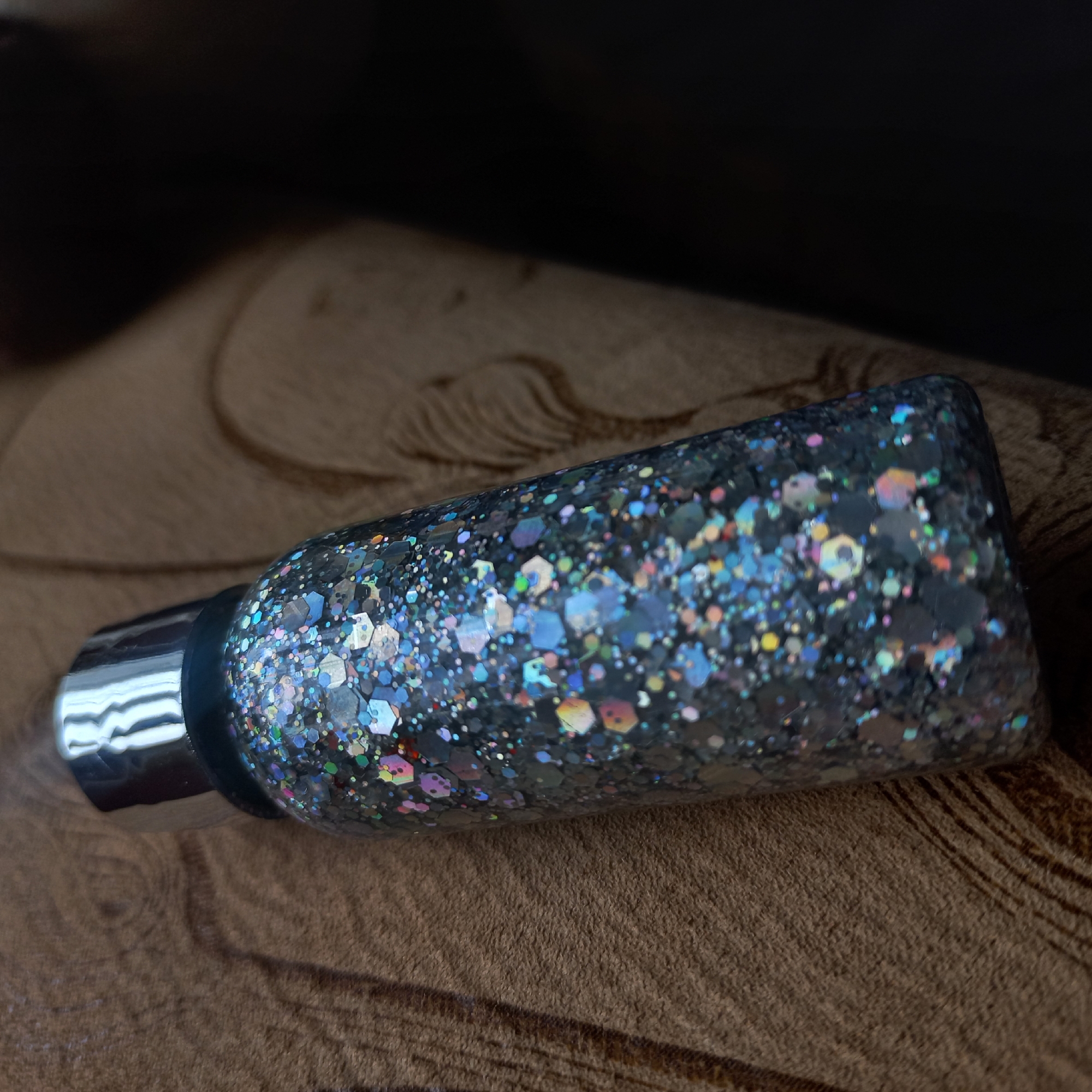 A clear cylindrical bottle, filled with multi-colored iridescent glitter, rests diagonally on a light brown, textured surface. The glitter within the bottle includes hexagonal and circular shapes, reflecting hues of blue, silver, pink, and green against a dark base medium. A reflective silver cap seals the bottle. The supporting surface displays a subtle embossed or woven pattern. The background on the right and upper right is dark, indicating a poorly lit area or shadow. No individuals or active subjects are present in the scene. The location is the city of Kurganinsk, Russia.