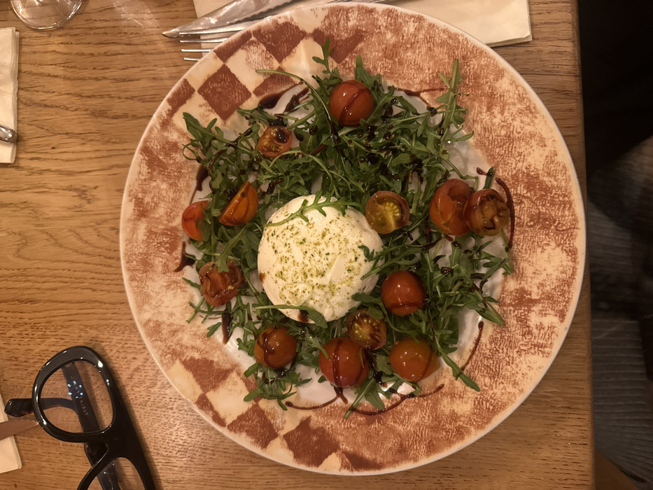 - "A plate of food features a central ball of white burrata cheese, speckled with green herbs" by FM-Jls162, licensed under CC BY 4.0
