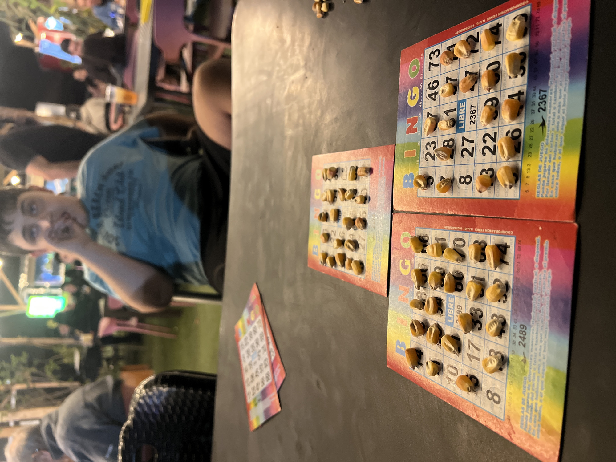 The image depicts a casual scene in what appears to be a semi-outdoor setting in Arica, Chile. A young man in a blue t-shirt is visible on the left, seated at a dark table. The table is covered with several Bingo cards, each partially covered with dried corn kernels to mark the called numbers. The Bingo cards are in Spanish. Another person is partially visible behind the young man in the blue t-shirt. The background shows a dimly lit outdoor area, possibly a patio or garden, with other people and illuminated elements. The game being played is a variant of Bingo, using corn kernels as markers, indicating a traditional setting within the city of Arica.