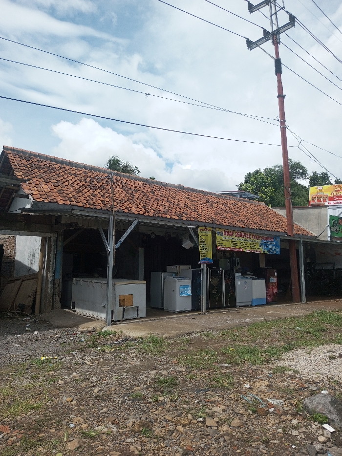 A roadside shop is under a terracotta-tiled roof, supported by a metal frame. The shop displays an assortment of used refrigerators and freezers. A utility pole with overhead wires stands nearby. The ground in front of the shop is gravelly with sparse vegetation. Banners hang above the refrigerators, and a commercial sign is visible on the adjacent building. The sky above is partly cloudy.
