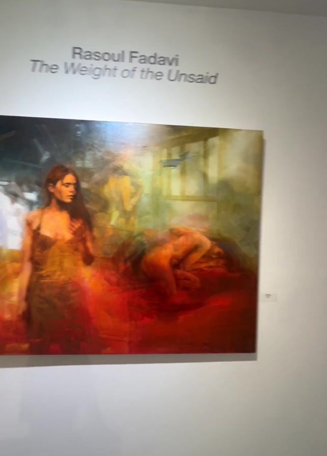 n art gallery with white walls and a concrete floor. Several paintings are hanging on the walls. The first painting is by Rasoul Fadavi and titled "The Weight of the Unsaid." The painting depicts three figures: one woman standing, another partially visible in the background, and a third lying down. The room is well-lit. The video pans across the gallery, showing more paintings with abstract figures and colors.