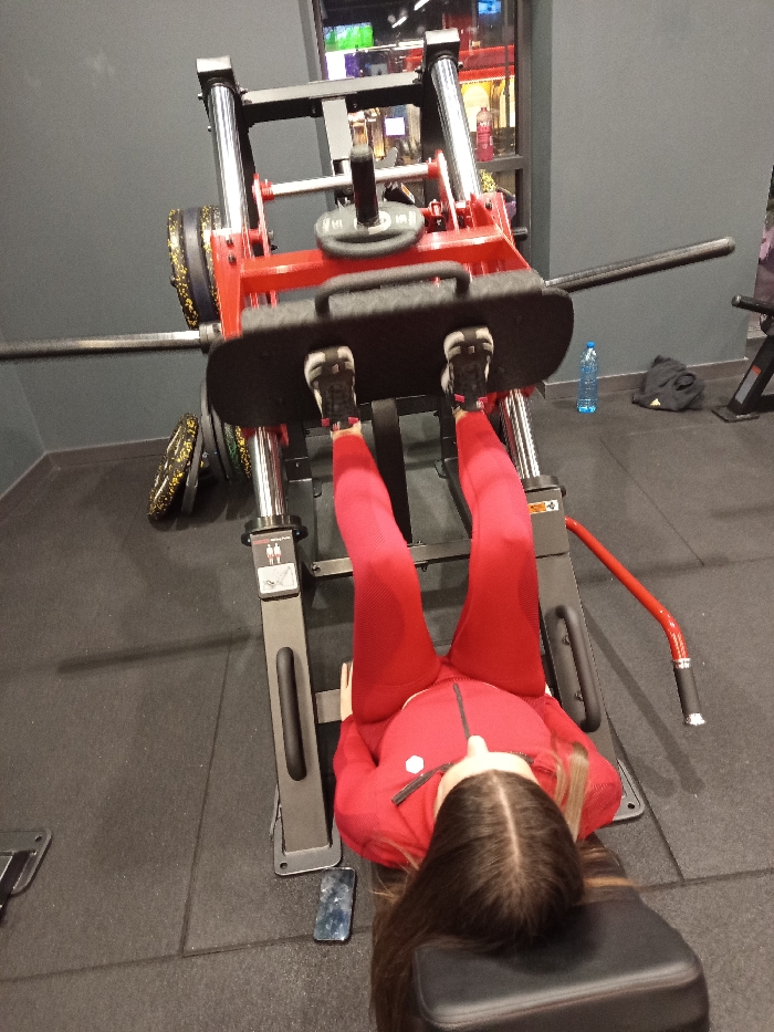 A solitary individual is observed performing a leg press exercise within an indoor fitness center located in the City of Unknown, Unknown