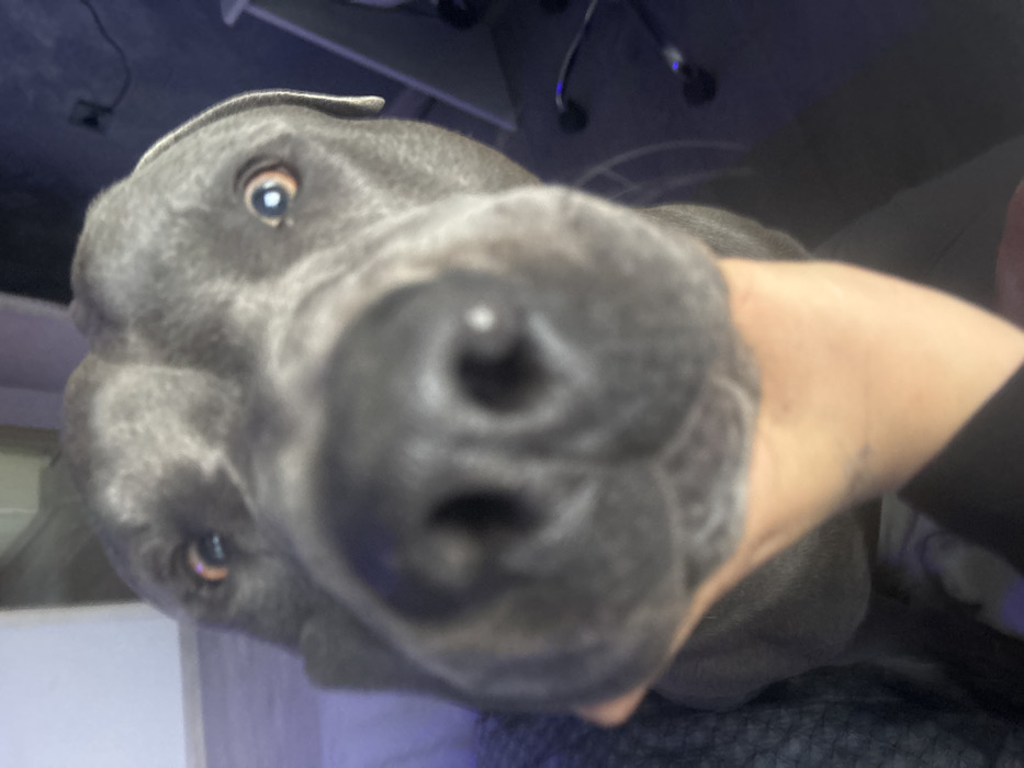- "The scene depicts a close-up, frontal view of a large, short-haired grey dog, likely a Cane Corso or similar breed, situated indoors in Krivina, Bulgaria" by FM-BJ96k2, licensed under CC BY 4.0