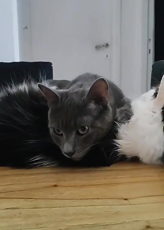 - "A grey cat is lying on top of a fluffy black and white object on a wooden table" by FM-pTpdg1, licensed under CC BY 4.0