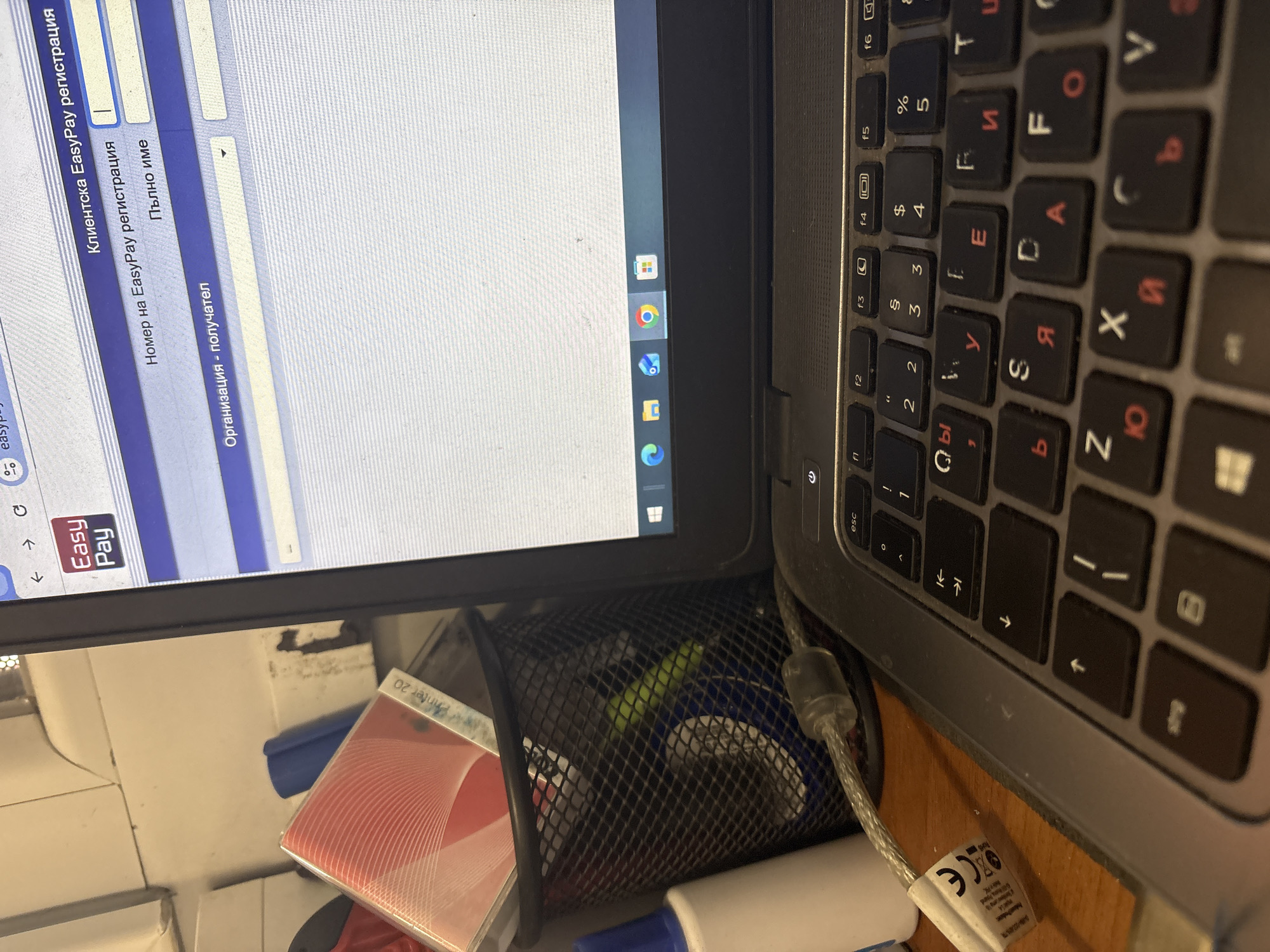 An indoor workstation is depicted, consistent with an office or home environment within Goce Delchev, Bulgaria, though the precise location within the city is not discernible from the image. A dark-colored laptop with a black keyboard featuring white Latin and red Cyrillic characters is positioned in the foreground and center. The laptop's screen displays a web page for "EasyPay registration" in Bulgarian, showing input fields labeled "Клиентска EasyPay регистрация" (Client EasyPay registration), "Номер на EasyPay регистрация" (EasyPay registration number), "Пълно име" (Full name), and "Организация - получател" (Organization - recipient). The Windows taskbar is visible at the bottom of the screen, displaying icons for Microsoft Edge, File Explorer, Mail, Google Chrome, and the Windows Start button. To the left of the laptop, on a wooden surface, a black metal mesh pen holder contains a red and white patterned item (partially labeled "P-nter 20"), a blue cylindrical object, and a green object. Adjacent to the pen holder is a white cylindrical bottle with a blue cap. A silver-braided USB cable with an integrated ferrite bead is connected to the laptop's left side and extends towards the viewer's left, displaying a "CE" mark on its attached tag. The background features a light-colored wall or partition exhibiting minor blemishes. No individuals are present in the scene.