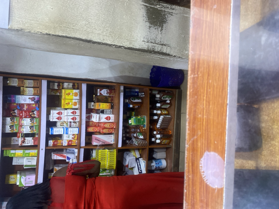 A wooden shelf filled with various over-the-counter medicines is visible. The shelf is divided into sections, each holding a different brand or type of medicine. A woman in a red dress partially obstructs the lower part of the view. The photo is slightly rotated and has a blurry background. A blue plastic basket sits on the upper right part of the shelf. A wooden pillar or frame is on the right side of the image, partially blocking the view.