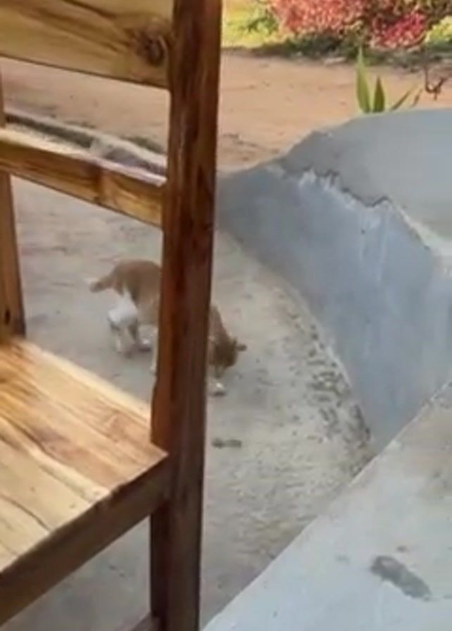 n orange and white cat walking along the side of a concrete planter. The cat is moving slowly and deliberately, occasionally sniffing the ground. A wooden chair is to the left of the cat. The background includes flowers and a building. The scene is bathed in natural sunlight.