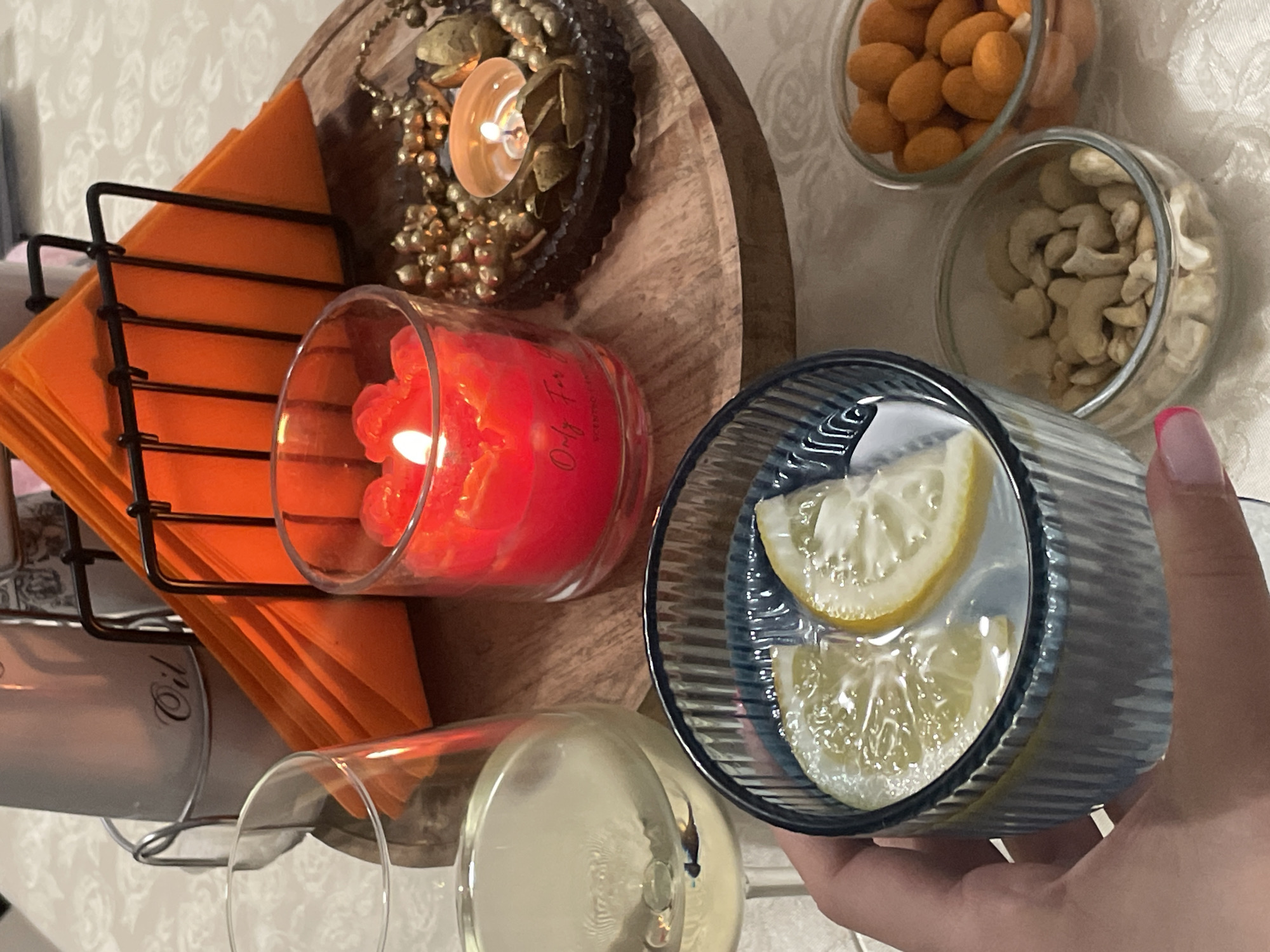 table setting, likely indoors. A round, wooden tray holds several items. There is a stack of orange napkins in a black metal holder, a lit red candle in a glass container, and a decorative candle holder with a lit candle. Two clear glass bowls contain almonds and cashews. A blue textured glass holds water with lemon slices. A partially visible wine glass is also present. A person's hand is holding the blue glass. The image was not taken in Smolyan, Bulgaria.