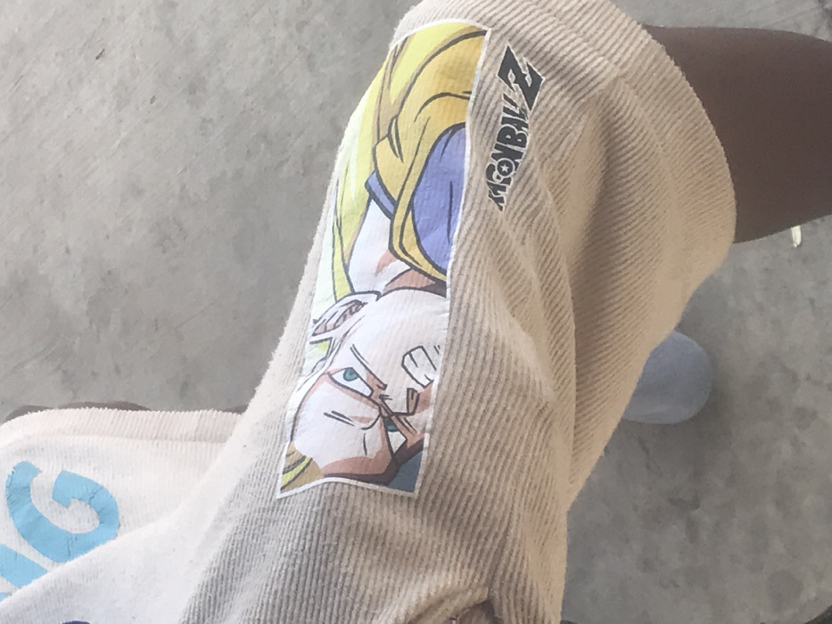 The image depicts a close-up, downward-angled view of a person's upper thigh area in Jos, Nigeria. The individual, who has dark skin, is wearing light beige corduroy shorts. On the outer thigh of the left leg, a rectangular graphic print features an anime character from Dragon Ball Z with spiky blonde hair, green eyes, and an intense, focused expression. Below this graphic, the "DRAGON BALL Z" logo is visible in black text. In the upper left corner, a segment of white, textured fabric, possibly from another garment, displays a light blue letter "G". The background consists of a grey concrete surface, with a light blue object, possibly footwear, partially visible on the ground. No specific actions or interactions are discernible.