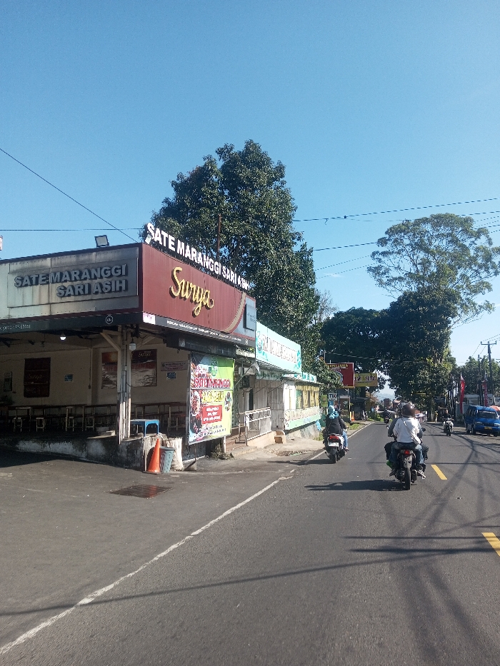 A daylight street scene depicts a two-story commercial building on the left, featuring prominent signage. The upper facade displays "SATE MARANGGI SARI ASIH" in white text on a grey background and "Surya" in gold script on a reddish-brown panel. The lower level is an open-air dining area with visible tables and chairs, currently unoccupied. An orange traffic cone and a blue container rest on the low wall in front of the building. Adjacent to it, another light-colored building has a banner displaying "SATE MARANGGI". The asphalt road in the foreground has white and yellow markings. Multiple motorcycles are observed on the road, traveling away from the camera. The closest motorcycle, green in color, is ridden by an individual in a white long-sleeved shirt and helmet. Behind it, another individual on a dark scooter wears a light blue top and helmet. Further down the road, additional motorcycles and a blue van or small truck are visible. The street is lined with tall green trees, and utility lines cross a clear blue sky. The visible signage, particularly "SATE MARANGGI", refers to a specific Indonesian dish and is written in a language associated with Indonesia, which contradicts the provided location of Niz Lakuk, India.