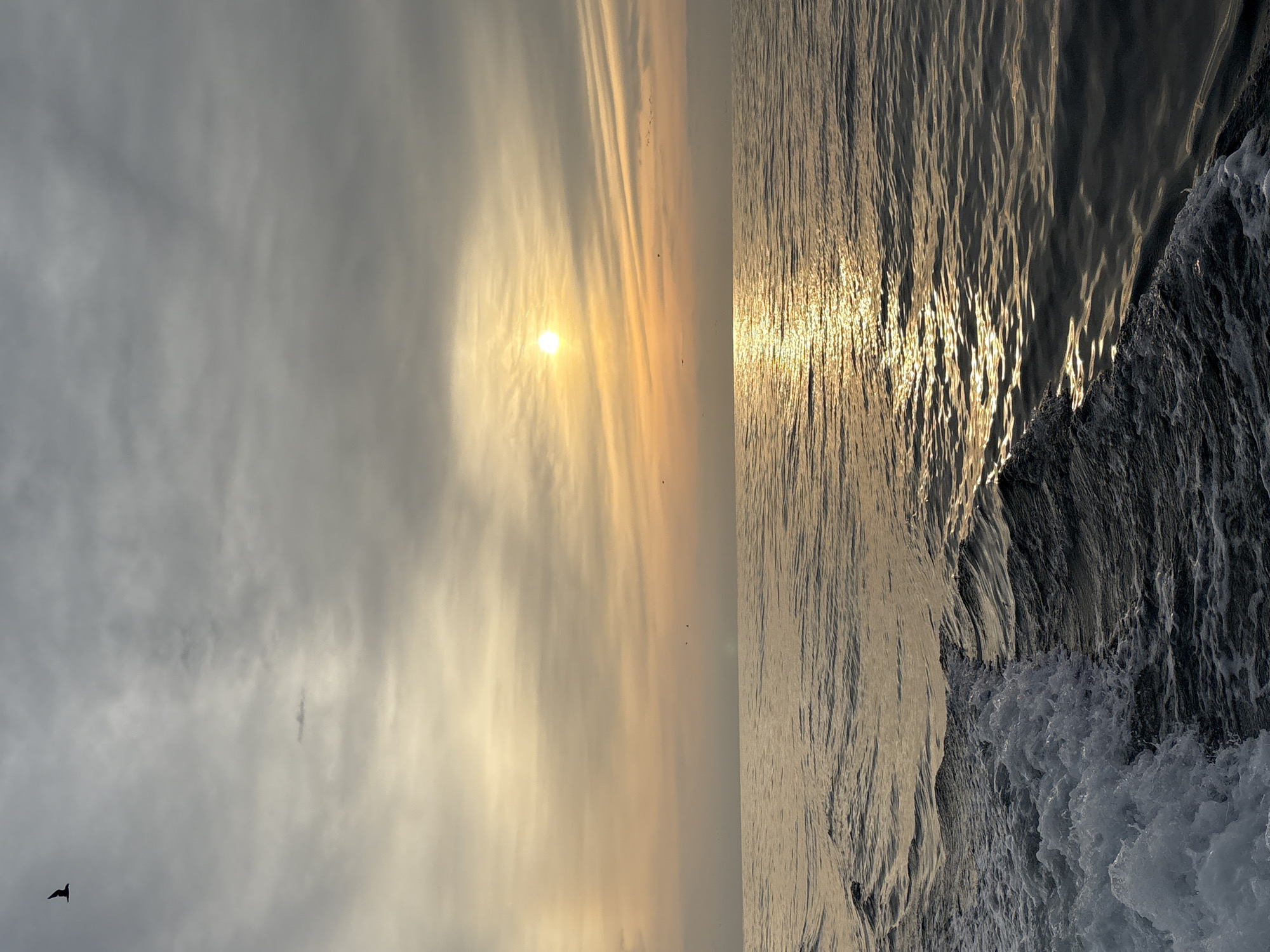 This image depicts an open ocean environment off the coast of Ancón, Peru, at either sunrise or sunset. The sun, a bright golden circular object, is positioned in the upper-right quadrant of the frame, casting a strong golden light reflection across the water surface, creating a distinct path towards the foreground. The sky is partially overcast with a mix of grey and warm golden clouds, particularly concentrated near the horizon. The water, likely the Pacific Ocean, is dark grey and exhibits a choppy texture with discernible waves. In the lower-left corner, a prominent area of white, turbulent foam is present, indicative of a vessel's wake. Several dark bird silhouettes are visible; one larger bird is in flight in the upper-left quadrant, and multiple smaller bird silhouettes are scattered across the sky near the horizon. No human subjects or other man-made structures are visible.
