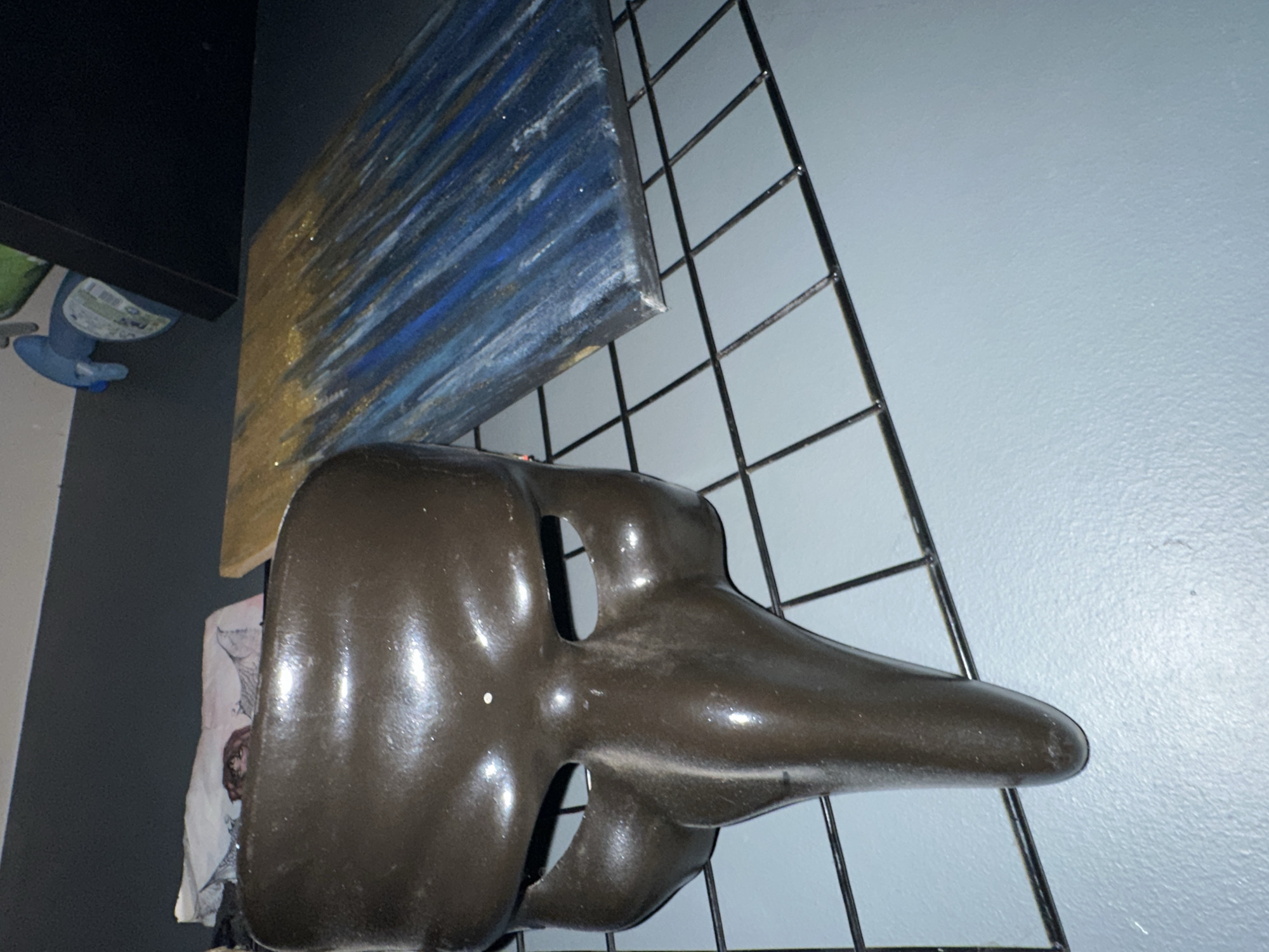 - "A dark brown, high-sheen plague doctor-style mask with prominent eyeholes and an extended beak is positioned in the foreground, resting on a black wire grid" by FM-iKko62, licensed under CC BY 4.0