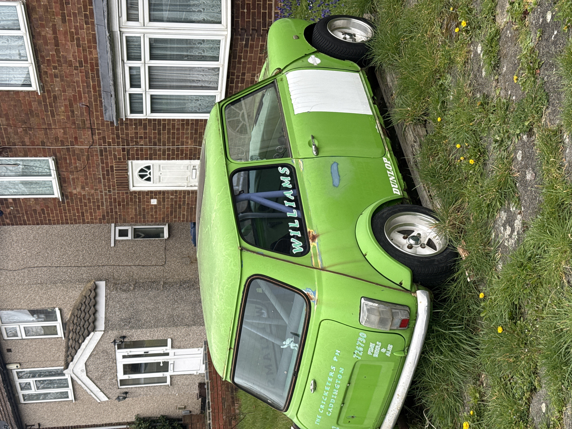 The scene depicts a bright lime green, heavily modified classic Mini automobile parked on an overgrown paved surface in a residential area of Hertsmere, United Kingdom. The vehicle exhibits significant external wear, including faded paint, rust around window frames, and dirt accumulation. It features aftermarket white multi-spoke alloy wheels, low-profile tires, an internal blue roll cage, and visible racing-style seats. Decals on the vehicle include "WILLIAMS" on the rear side window, "DUNLOP" near the front wheel, and text on the rear hatch detailing "THE CRICKETERS PH CADDINGTON", "726730", and "FINE BEERS & ALES". A small white figure, resembling a cartoon turtle, is affixed to the inside of the rear window. The passenger side door features a rectangular white panel, possibly a repair. The car rests on wooden planks amidst grass, dandelions, and a patch of purple flowers (bluebells) in the immediate foreground. In the background, two semi-detached residential houses are visible. The house on the left has a light brown rendered exterior, white PVC windows, and a front door with a tiled canopy, marked with the number "3". The house on the right is red brick with white PVC windows, a large ground-floor bay window, and a small front door marked with the number "71". External wiring runs along the brick wall of the right house. No individuals are present.
